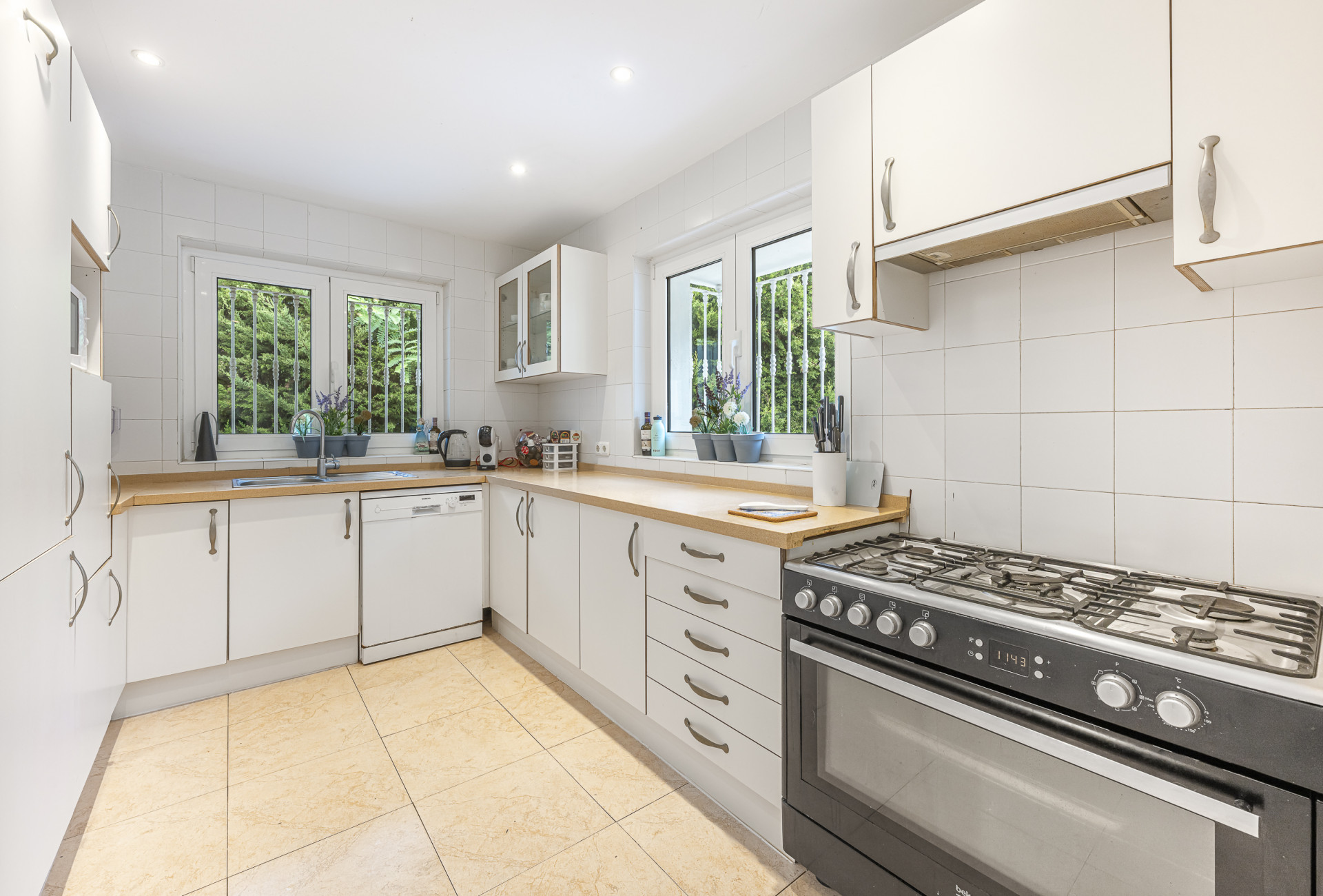 Set on a 1,148 m² plot, the villa features 238 m² built with four spacious bedrooms, four bathrooms, and a private pool surrounded by mature gardens. The layout is both practical and inviting — three bedrooms are located on the ground floor for easy everyday living, while the master suite enjoys complete privacy on the upper level.